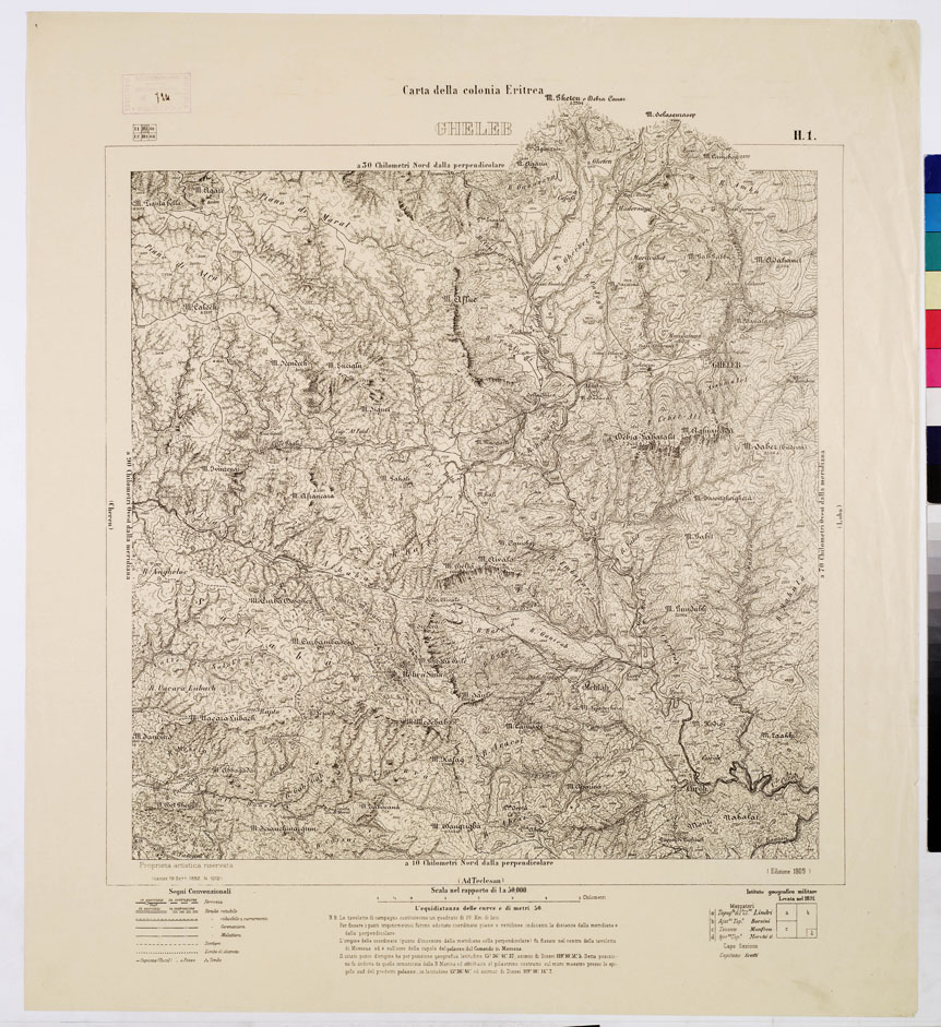 "I.G.M. Rriproduzione fotozincografica delle levate originali eseguite alla medesima scala tra gli anni 1885 e 1891.Questa carta comprende la parte centrale della Colonia tra Zula, Emberèmi, Giangheren e Himberti. La proiezione adottata fu quella del Cassini con centro di sviluppo la Cupola del Palazzo del Comando a Massaua la cui posizione geografica era stata determinata astronimicamente fin dal 1885 dalla R. Marina. La carta è in 26 fogli di m. 0,40 di lato, corispondente quindi a 20 Km. sul terreno. La pubblicazione fu inziata nel 1890 in edizione policroma (nero per la nomenclatura, le strade, le dune di sabbia azzurro per l'idrografia bistro per il terreno rosso per le quote trigonometriche) per i primi fogli e fu poi continuata in nero. In seguito la carta fu stampata interamente in nero. Nel 1909 fu allestita una nuova edizione in nero a curve di livello con equidistanza di 50 m. e numerose quote trigonometriche e topografiche. Fa eccezione il foglio Sciotel (rilevato dal Cap. Severi nel 1894) senza curve, con orografia a tratteggio. Nell'ultima edizione figurano in ciascun foglio i nomi dei mappatori e le date delle levate."
