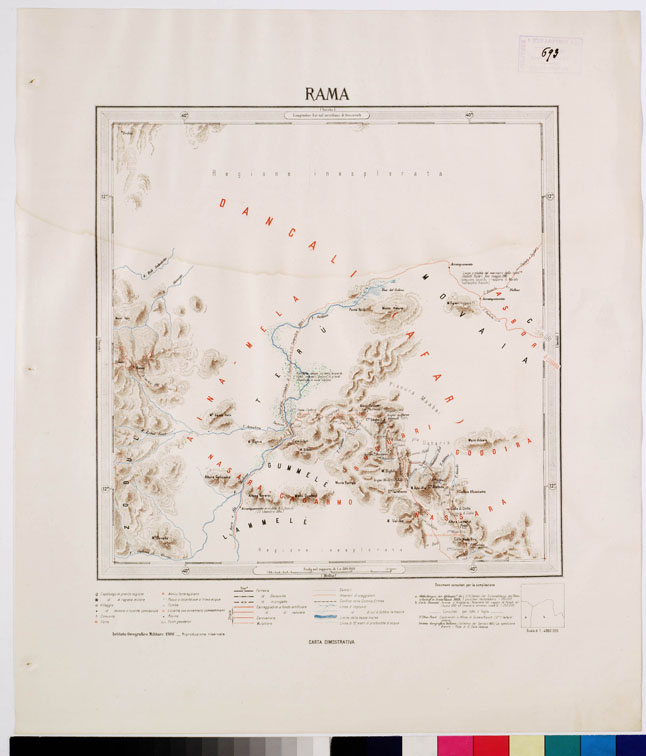 "I.G.M. Carta generale di carattere puramente descrittivo allestita dall'I.G.M. a fine di comprendervi quelle parti di territorio che con i lavori di rilievo regolari, iniziati in Colonia nel 1888, erano rimasti esclusi, e di utilizzare tutti i materiali nuovi che, con le ricognizioni, gli itinerari, gli schizzi, parziali dovuti a ufficiali e funzionari della Colonia, viaggiatori e studiosi, potevano essere ormai impiegati. La pubblicazione della carta fu iniziata nel 1897 e veniva ultimata nel 1902. La carta consta di 30 fogli di 1° di longitudine per 1° di latitudine e comprende il territorio limitato fra il 12° ed il 16° parallelo e fra il 36° meridiano ed il mare. Dei primi fogli fu anche seguita un'edizione al 250.000 in riproduzione degli originali disegnati, ma la pubblicazione non fu poi continuata. Servirono di base per la compilazione della carta le triangolazioni eseguite dall'I.G.M., le determinazioni astronomico-geodetiche dell'Ufficio Idrografico della R. Marina, del geografo D'Abbadie e quelle effettuate durante la spedizione inglese nel 1868. La proiezione impiegata fu la policentrica, sostituita fin dal 1896 a quella del Cassini anteriormente usata per i lavori topografici nella Colonia. Le longitudini furono riferite al meridiano di Greenwich. Per la parte topografica vennero ridotti i rilievi regolari alla scala di 1:50.000 e 1:100.000 dell'I.G.M. oltre le altre fonti sopra menzionate. In relazione alla disponibilità dei documenti utilizzabili, il dettaglio non appare rappresentato con la stessa uniformità nei singoli fogli. Ogni foglio porta nell'angolo inferiore l'indicazione dei documenti sui quali è fondato. La carta è stampata in litografia a colori con orografia a tratteggio in bistro, idrografia in azzurro, rete stradale e itinerari in rosso, vegetazioni in verde, ferrovie e gli altri particolari in nero. Si è impiegata la scrittura in rosso per i nomi delle divisioni politiche e regionali e in nero per i nomi etnografici. I nomi tutti sono scritti con grafia italiana. I fogli furono disegnati alla scala di 1:200.000 e ridotti con la fotozincografia al 400.000. Utilizzando gli elementi della "Carta dimostrativa della Colonia Eritrea" al 500.000 (ved. N° 50 d'ordine, N. 694 d'inventario generale) e altri raccolti per nuove zone della regione, fu allestita una nuova edizione della carta corretta e accresciuta. Essa fu estesa al 18° parallelo per includervi Ras Casar (18° 2') e a sud fino all'11° parallelo per la parte che trovasi ad oriente del 40° meridiano comprendendo così tutta la regione estrema meridionale dell'Aussa e il territorio adiacente alla Baia di Tagiura. La nuova edizione fu pubblicata in 12 fogli interi di 2° di long. per 2° di lat. e due mezzi fogli per la parte meridionale. Fu ultimata nel 1909. Tenuta al corrente per qualche tempo, passò fra le carte di mobilitazione nel 1927."