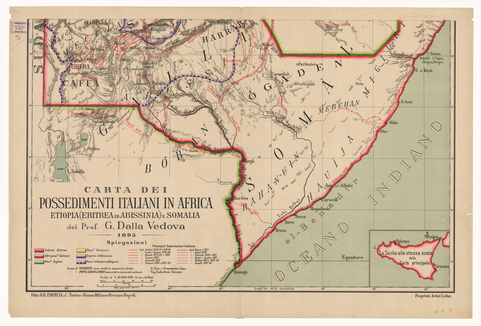 CARTA DEI POSSEDIMENTI ITALIANI IN AFRICA. ETIOPIA - ERITREA ED ABISSINIA - SOMALIA DEL PROF. G. DELLA VEDOVA - Foglio 1