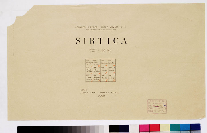 "COMANDO SUPERIORE F.F.A.A. REPARTO SPECIALE TOPOCARTOGRAFICO. Ingrandimento Carta dimostrativa della Libia 1:400.000 rilevamento della costa eseguito dalla R. Marina tracciato della Via Balbia dell'Ufficio Spec.le della Strada. Itinerari vari eseguiti da topografi dell'I.G.M. Determinazioni astronomiche speditive e triangolazioni trigonometriche dell'I.G.M. e della R. Marina. Informazioni varie."