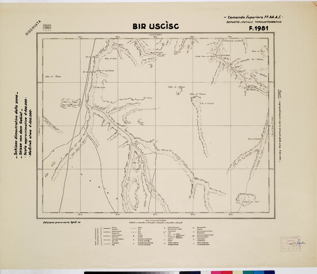 "COMANDO SUPERIORE F.F.A.A. REPARTO SPECIALE TOPOCARTOGRAFICO. Ingrandimento Carta dimostrativa della Libia 1:400.000 rilevamento della costa eseguito dalla R. Marina tracciato della Via Balbia dell'Ufficio Spec.le della Strada. Itinerari vari eseguiti da topografi dell'I.G.M. determinazioni astronomiche e speditive e triangolazione trigonometriche dell'I.G.M. e della R. Marina. Informazioni varie."