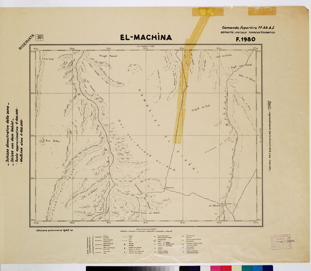 "COMANDO SUPERIORE F.F.A.A. REPARTO SPECIALE TOPOCARTOGRAFICO. Ingrandimento Carta dimostrativa della Libia 1:400.000 rilevamento della costa eseguito dalla R. Marina tracciato della Via Balbia dell'Ufficio Spec.le della Strada. Itinerari vari eseguiti da topografi dell'I.G.M. determinazioni astronomiche speditive e triangolazione trigonometriche dell'I.G.M. e della R. Marina. Informazioni varie."