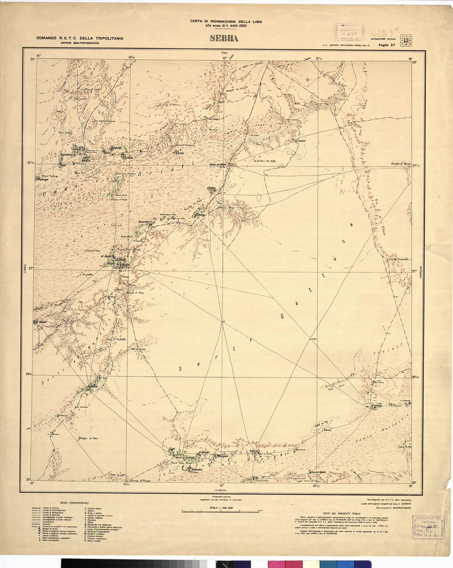 "Alla scala di 1:400.000. SEBHA. (Ed. provvisoria). Comando R. C. T. C. della Tripolitania. Ufficio Geo-Topografico. Un foglio in tipolitografia del R. C. T. C. della Tripolitania. Lucido dell'originale eseguito dal sergente V. Clementi. Riproduzione in fotocollozincografia. Stampa a colori. Il terreno è rappresentato a fondo unito giallino con forme del rilievo rappresentate mediante curve dimostrative in bistro, acque in azzurro, vegetazioni in verde, rete stradale in nero. La carta distingue i limiti di colonia, di commissariato, di delegazione, di distretto, le carrozzabili a fondo artificiale e a fondo naturale, le carovaniere, le ferrovie in esercizio, in progetto e in costruzione, pozzi d'acqua potabile e salmastra, cisterne, castelli, ruderi, forti, chiese, moschee, marabutti, cimiteri, ecc., vegetazioni, punti astronomici e geodetici, scali aeronautici. In basso a sinistra la leggenda dei segni convenzionali a destra è data indicazione delle fonti impiegate nella compilazione del foglio. "
