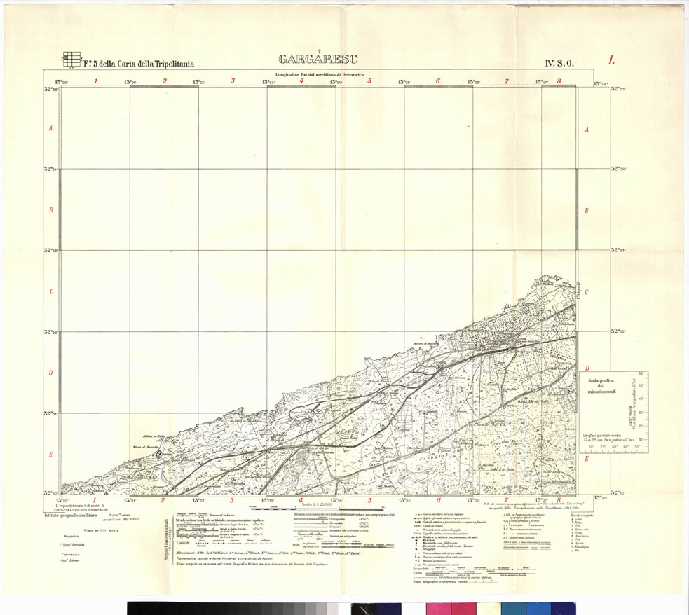 "Governo della Tripolitania Ufficio Studi. I.G.M. La carta si compone di quattro fogli: 1) Gargàresc 2) Tripoli 3) Tagiùra 4) Punta Tagiùra. È ricavata da rilievi eseguiti da personale dell'I.G.M. messo a disposizione del Governo della Tripolitania. Stampa in nero. Orografia a curve di livello tracciate all'equidistanza di 5 m. La carta è ricca di segni convenzionali: distingue abitati e costruzioni isolate, strade, ferrovie, ponti, risorse idriche, vegetazioni, ecc., limiti mministrativi. In basso, su ciascun foglio, trovasi la leggenda dei segni convenzionali e il quadro sinottico dei rilievi col nome dell'operatore e la data rispettiva. Toponomastica secondo le norme ministeriali a cura del col. De Agostini. Annesso alla carta è l'indice dei nomi contenuti nei fogli e un fascicolo contenente notizie illustrative circa la costruzione della carta e cenni sul territorio."