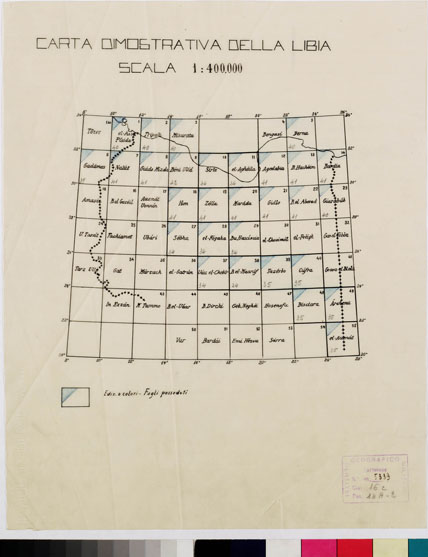 "Autore Ufficio Topocartografico - Comando Superiore delle Forze Armate Africa Settentrionale. Carta dimostrativa della Libia, derivata dalle levate al 100.000 dell' I.G.M. e dalla cartografia regolare Francese. La toponomastica è stata riveduta dall' Ufficio studi e Traduzioni del Governo Generale della Libia."