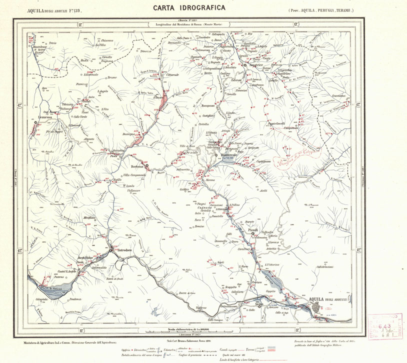 "Pubblicata per cura del Ministero di Agricoltura Industria e Commercio. Direzione Generale dell'Agricoltura. In basso al centro la spiegazione dei segni convenzionali. In basso a destra la dicitura "Formato in base al foglio della carta al 100/m. pubblicata dall'I.G.M. ". R. Stab. Cart. C. Virano, Roma 1890."