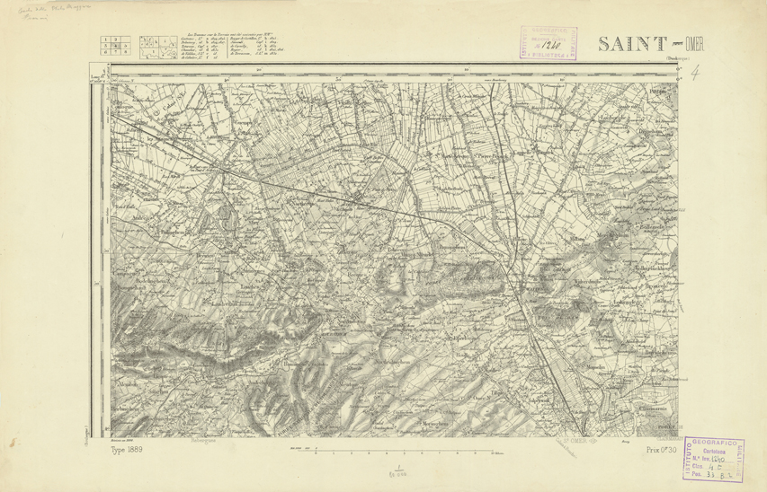 "Paris. Service Géographique de l'Armée, 1889. Ebbe origine dall'Edizione zincografica in quarti di foglio, stabilita dal 1879, per la carta detta de "L'Etat-Major". Infatti non rispondono più il sistema della riproduzione zincografica alle esigenze che la revisione dei fogli imponeva, per un inevitabile logoramento dei rami originali, fu proposta dapprima la correzione degli zinchi, ma questo, importando un lavoro lungo e gravoso, si adottò il procedimento galvanico. I rami galvanici ottenuti e corretti secondo questo sistema presero il nome di "édition type 1889". Allo scopo di facilitare l'incisione fu adoperata la suddivisione in quarti di foglio come per l'edizione zincografica. La revisione dei fogli di questo tipo non fu iniziata che nel 1893. Dal catalogo del S.G.A. risultano mancanti a questa edizione i dipartimenti della "Moselle", del "Bas-Rhin" e del "Haut-Rhin" per i quali non esiste che una edizione in fogli interi aggiornata nel 1901."