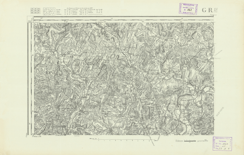 "Paris. Service Géographique de l'Armée, 1889. Ebbe origine dall'Edizione zincografica in quarti di foglio, stabilita dal 1879, per la carta detta de "L'Etat-Major". Infatti non rispondono più il sistema della riproduzione zincografica alle esigenze che la revisione dei fogli imponeva, per un inevitabile logoramento dei rami originali, fu proposta dapprima la correzione degli zinchi, ma questo, importando un lavoro lungo e gravoso, si adottò il procedimento galvanico. I rami galvanici ottenuti e corretti secondo questo sistema presero il nome di "édition type 1889". Allo scopo di facilitare l'incisione fu adoperata la suddivisione in quarti di foglio come per l'edizione zincografica. La revisione dei fogli di questo tipo non fu iniziata che nel 1893. Dal catalogo del S.G.A. risultano mancanti a questa edizione i dipartimenti della "Moselle", del "Bas-Rhin" e del "Haut-Rhin" per i quali non esiste che una edizione in fogli interi aggiornata nel 1901."