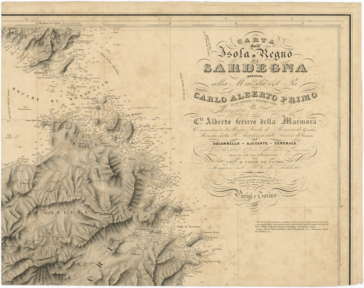 "Dedicata alla Maestà del Re Carlo Alberto Primo dal suo umilissimo e devotissimo suddito il Maggior Generale C.te Alberto Ferrero della Marmora, Comandante la Regia scuola di marina di Genova, Membro della R. Accademia delle Scienze di Torino già Colonnello -ajutante -Generale nel R. Corpo di Stato Maggiore Generale, assistito dal suo collaboratore * il cav. D. Carlo de Candia Maggiore nel R. Corpo suddetto. Incisa da Debuissons, Strada des bernardins, 24. Scritta da Arnoul impiegato al deposito della Guerra, addetto alla Carta di Francia_ Ibid. Paris e Torino, 1845. *Sui lavori trigonometrici e geodetici di questa carta incominciati nel 1824, e proseguiti quasi senza interruzioni sino al 1838, vedasi la notice inserita nel 1°vol 2 da Ediz (1839) del Voyage en sardaigne del medesimo autore. Parigi, presso Arthus Bertrand, strada Montefeuille, 23: e Chamerot, strada du jardinet, 13. La carta è in otto fogli sciolti conservati con tela. "
