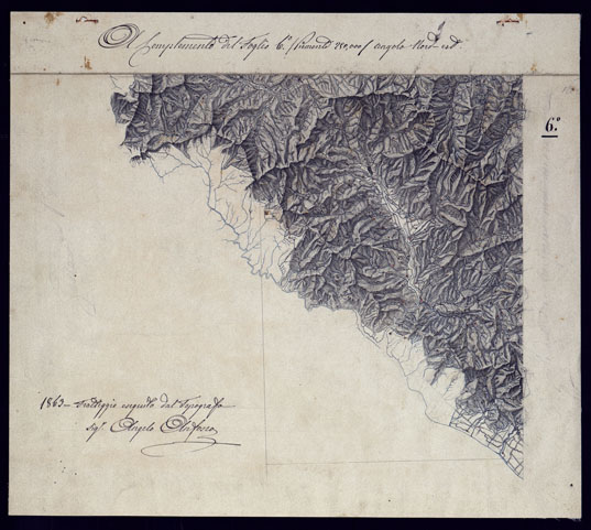"Disegno originale a penna a più colori, in 6 fogli + un supplemento del foglio 6 finemente eseguito e artisticamente tratteggiato per la rappresentazione orografica, che servì di modello per l'incisione su rame della corrispondente carta pubblicata nel 1841. Il disegno è opera dell'Ingegnere Topografo V. Brambilla, che alla pubblicazione di questa carta appunto la sua grande e meritata notorietà. (Vedi poer la storia di questa celebre carta A. Mori, "Cenni storici", citati)."