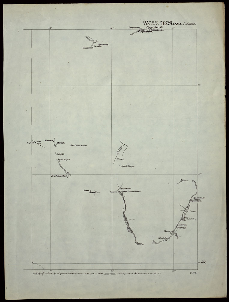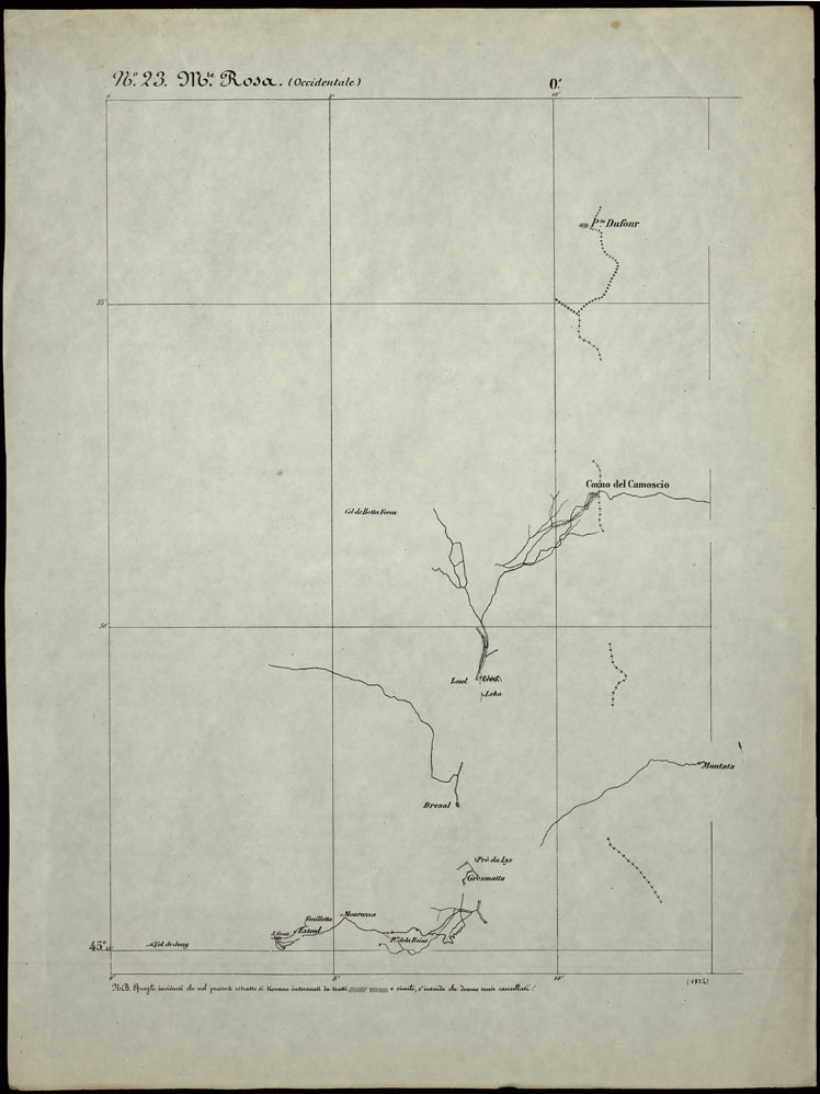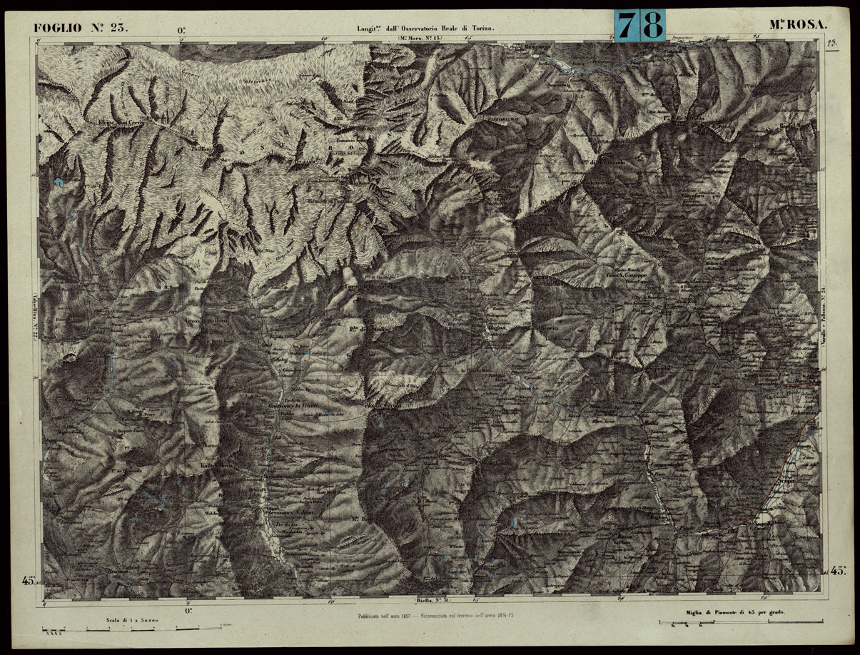CARTA TOPOGRAFICA DEGLI STATI IN TERRAFERMA DI S.M. IL RE DI SARDEGNA ALLA SCALA DI 1.A 50.000. OPERA DEL CORPO REALE DELLO STATO MAGGIORE - FOGLIO N.°23. MONTE ROSA + DOCUMENTO DI AGGIORNAMENTO PARTE OCCIDENTALE E ORIENTALE