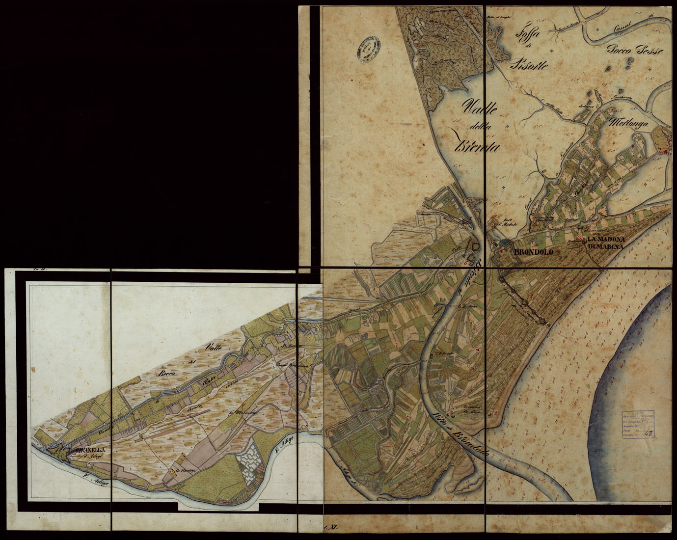 "Piano della città marittima e fortezza di Venezia colle sue lagune e colla terra ferma che le circonda, dalla foce dell'Adige a quella del Piave. Copia della carta del Denaix eseguita dal 1800 al 1808 alla scala di 1:18.000 in trenta fogli. Il disegno fu eseguito nel 1836 la riduzione nel 1837 a spesa del Genio terrestre austriaco. Consta di trenta fogli ad acquarello montati su tela. Colori usati: azzurro per l'idrografia, rosso per gli abitati e le strade principali, verde per le coltivazioni. Il foglio 1 contiene il quadro di unione. I fogli 9 e 10 recano il titolo il foglio 20 contiene notizie sulla costruzione della carta: il foglio 25 la rosa dei venti il foglio 30 notizie sulla laguna. Annessi alla carta sono un piano del Forte di S.Pietro pure ad acquarello alla scala di 1:2.500 e una carta dei "sondaggi lungo la costa tra il Forte Alberone e la Batteria Quattro Fontane" firmata "Salis Soglio maggio 1847"."