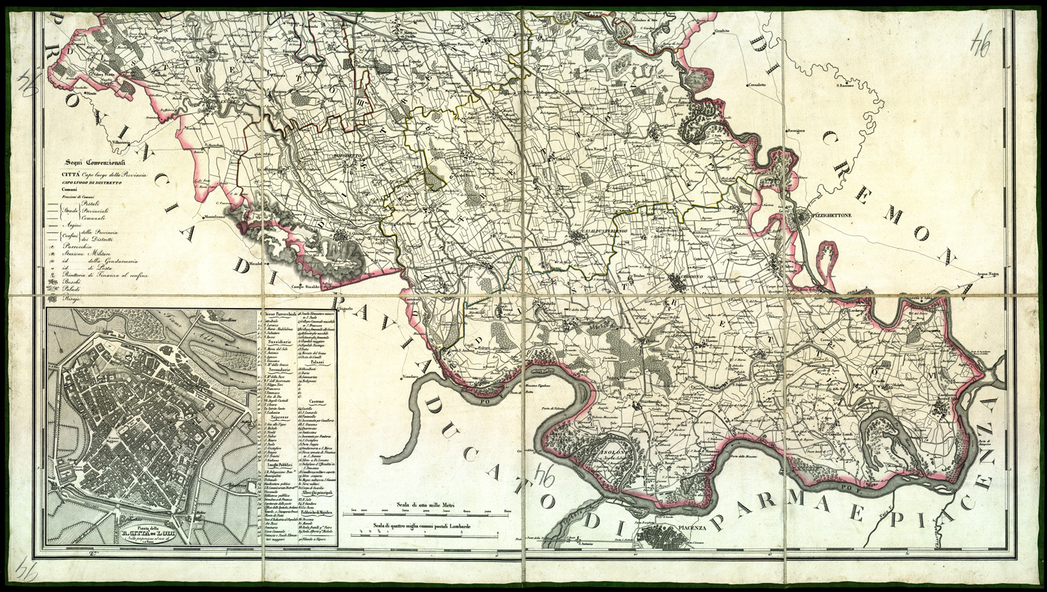 "Due fogli incisi su rame e montati su tela a stacchi. Carta derivata da quella di cui al n. 38 d´ordine (Collez. Bianconi, n. 69). Graduazione marginale. Longitudini calcolate dal meridiano dell'Isola del Ferro. Abitati rappresentati in pianta e distinti in base alla loro importanza amministrativa. Strade classificate in postali, provinciali e comunali. Sono indicate le stazioni militari e quelle postali, le ricettorie di finanza al confine, ecc., le risaie, i boschi, le paludi, ecc. Confini a colori. Il foglio nord contiene notizie statistiche e una pianta di Crema alla scala di 1:6.000 con elenco numerico degli edifici principali. Il foglio sud reca la legenda dei segni convenzionali e la pianta di Lodi, pure al 6.000, con annesso elenco numerico delle costruzioni. Due scale grafiche in metri e in miglia lombarde."